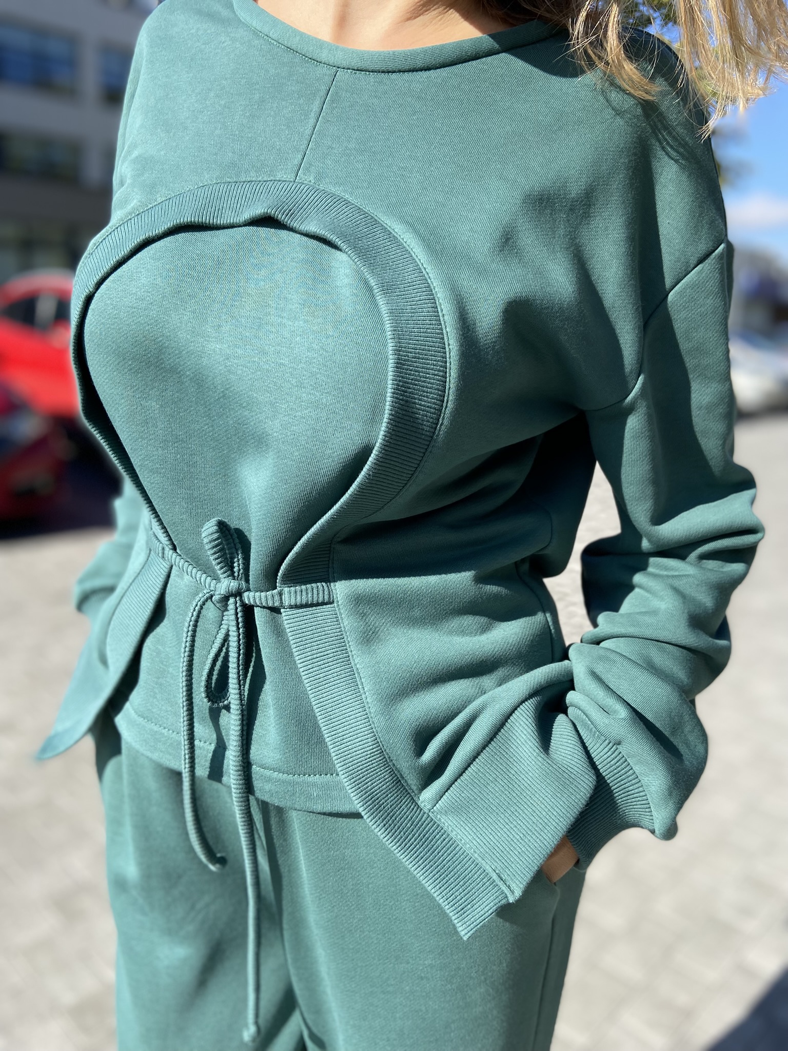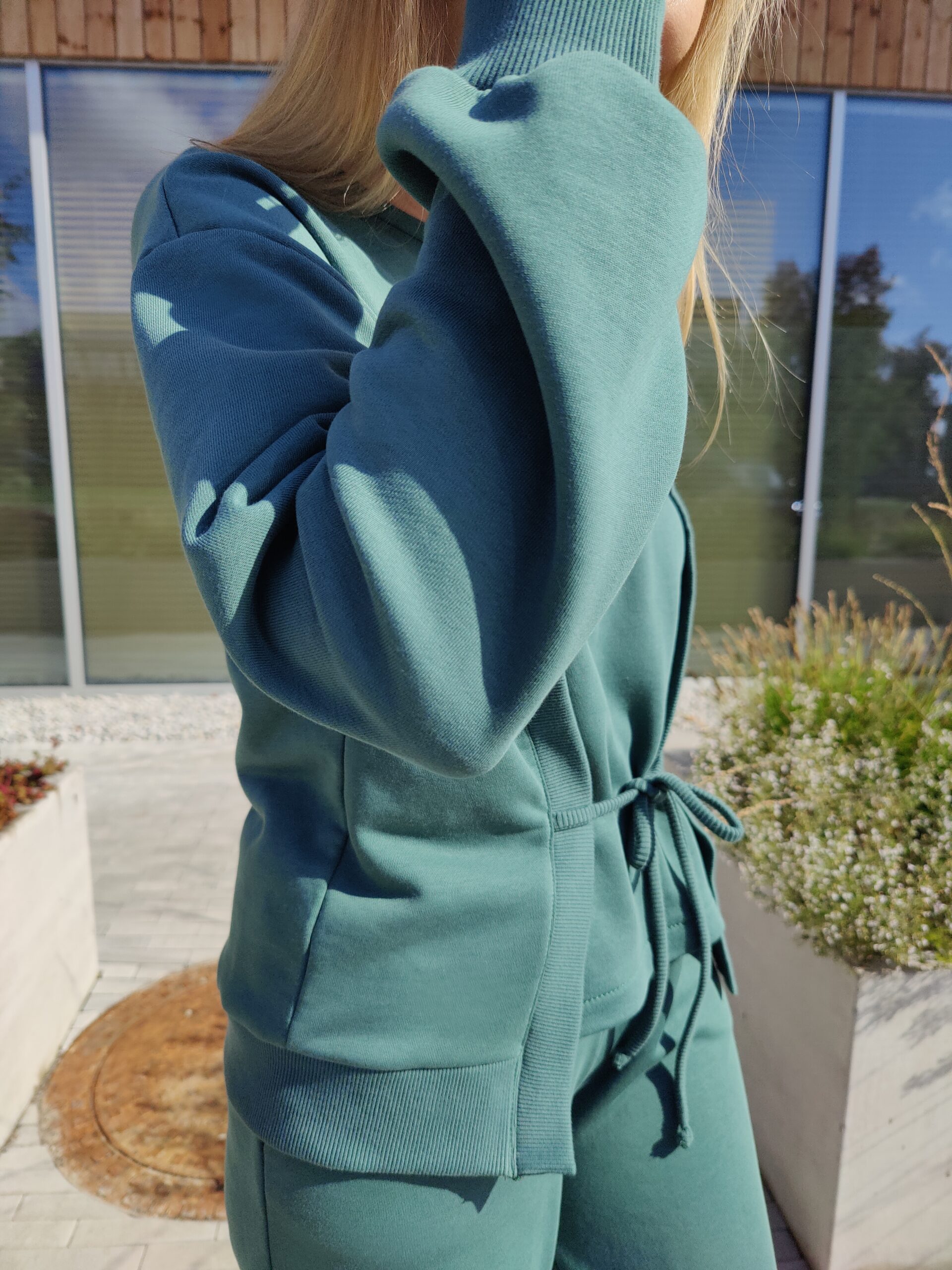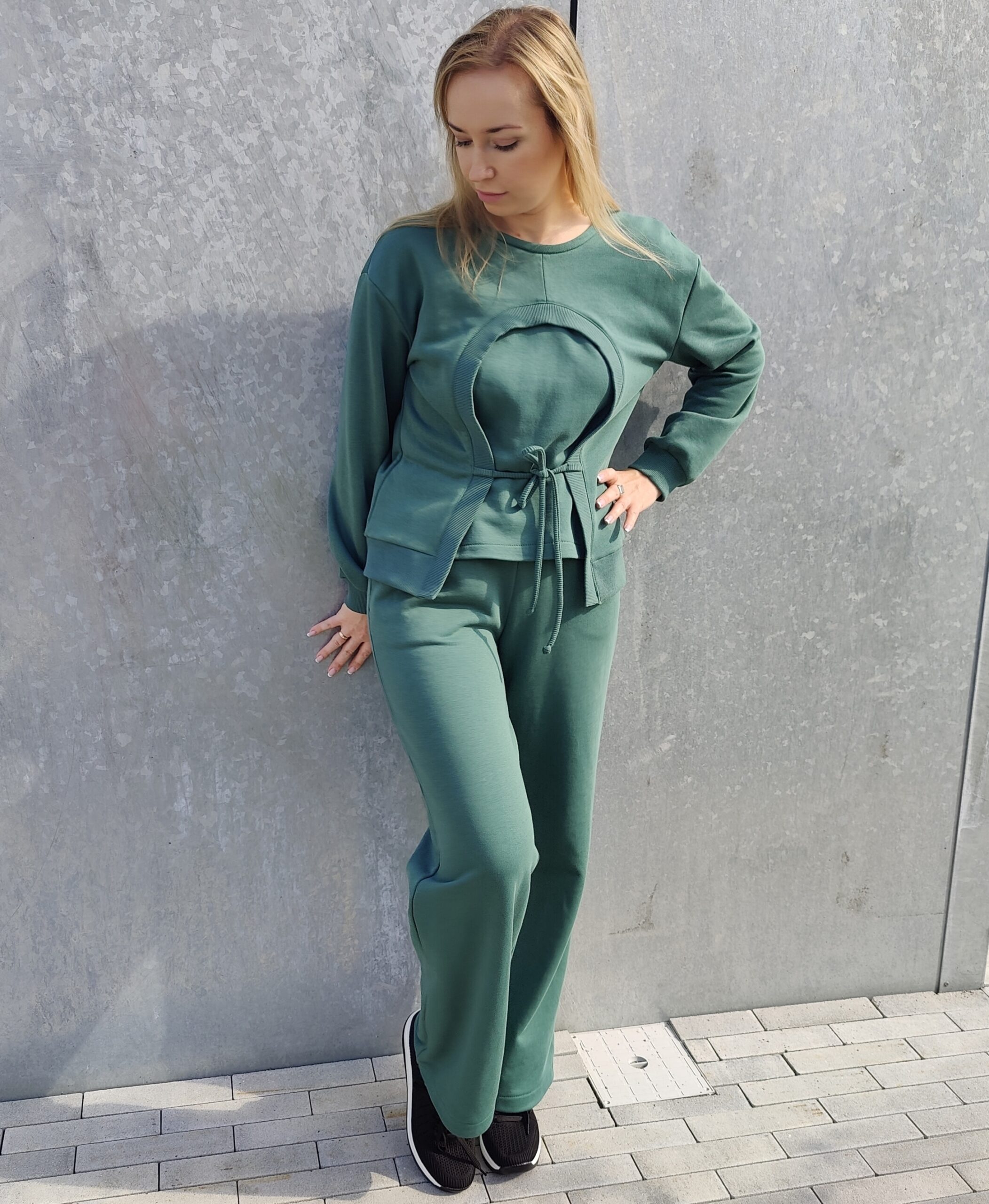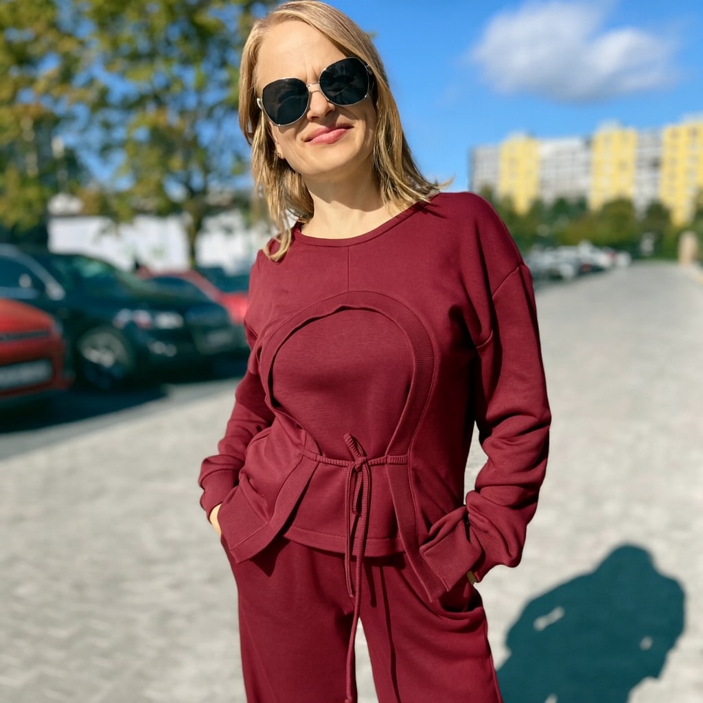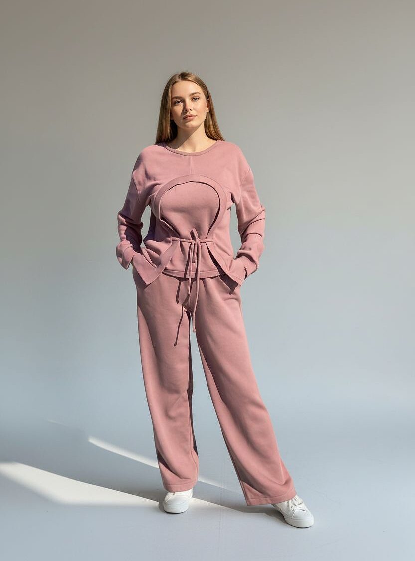Modernus dviejų dalių laisvalaikio kostiumas iš kokybiško audinio, kuris suteikia komfortą visą dieną. Džemperis su rib detalėmis ir priekyje reguliuojamu raišteliu, suteikiančiu išskirtinumo ir leidžiančiu lengvai priderinti siluetą. Plačios kelnės su kišenėmis užtikrina patogumą ir nevaržo judesių. Tai stilingas ir patogus pasirinkimas kasdienai, kelionėms ar jaukiam laisvalaikiui. Kelnių ilgis – 104 cm, tačiau galime jį pritaikyti pagal jūsų ūgį.