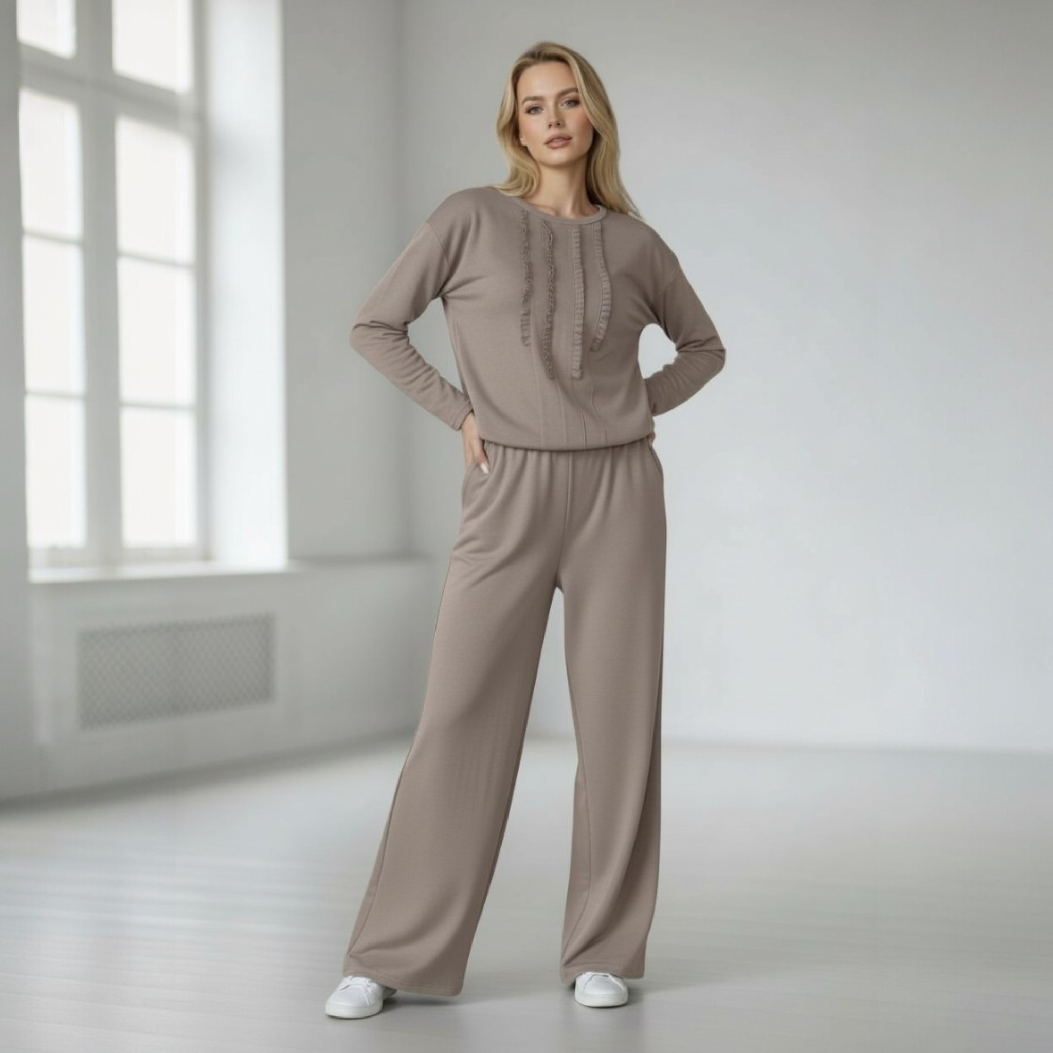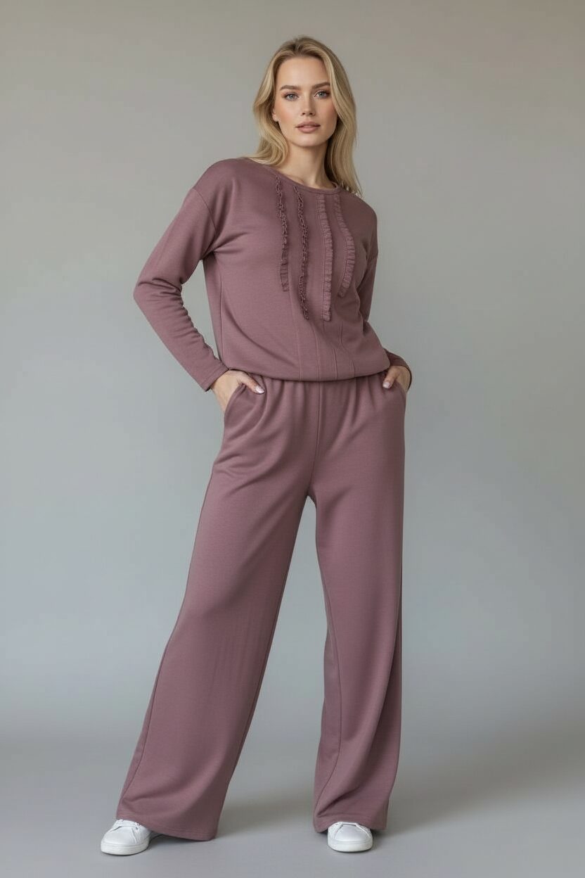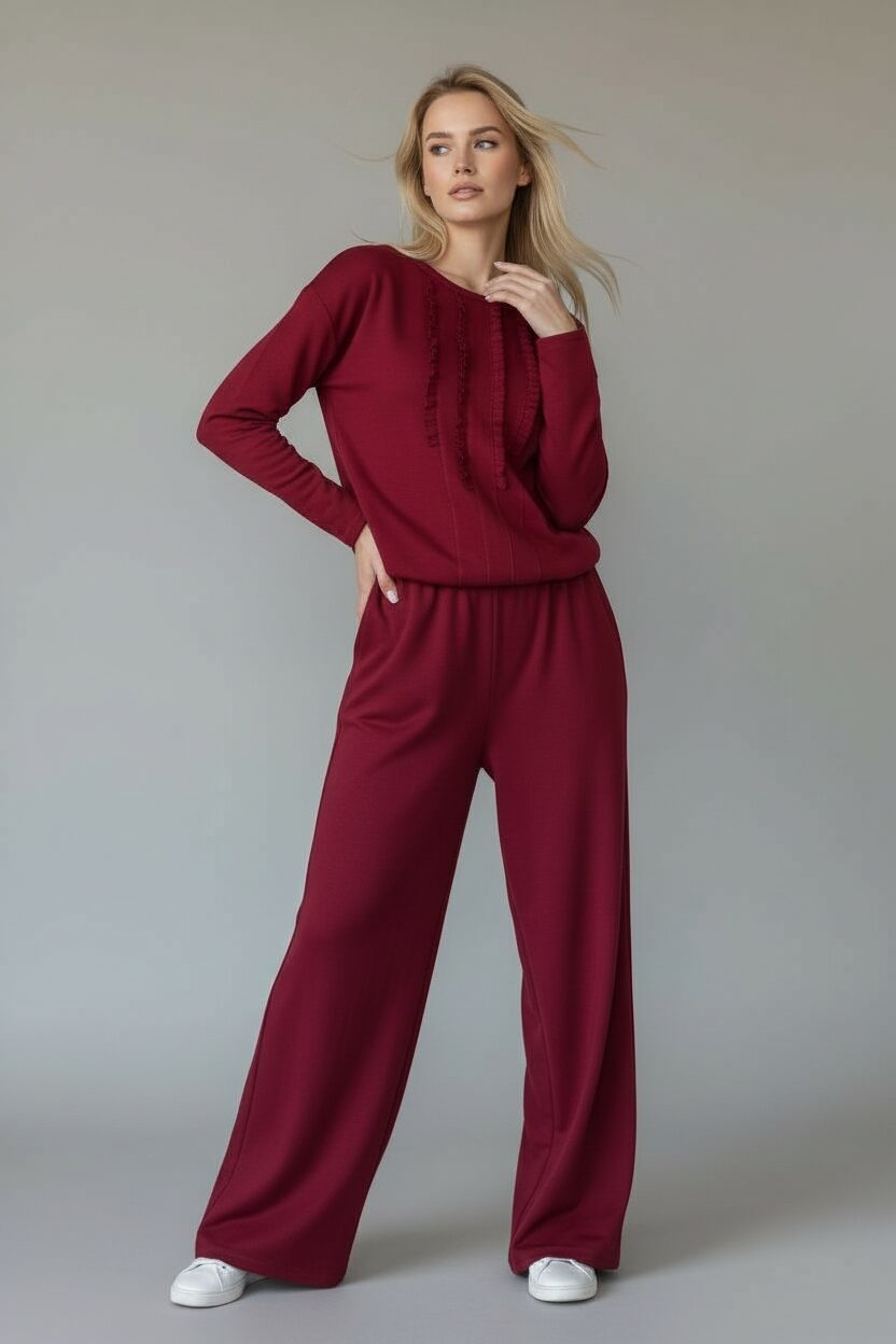 Patogus ir stilingas – puikus pasirinkimas vėsesniems orams. Kostiumėlį sudaro džemperis ir plačios kelnės, kuriuos galima nešioti kartu arba derinti atskirai.