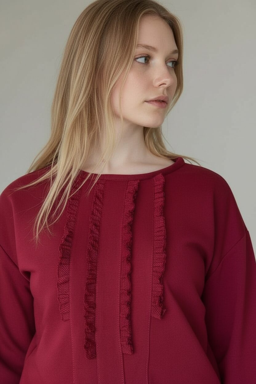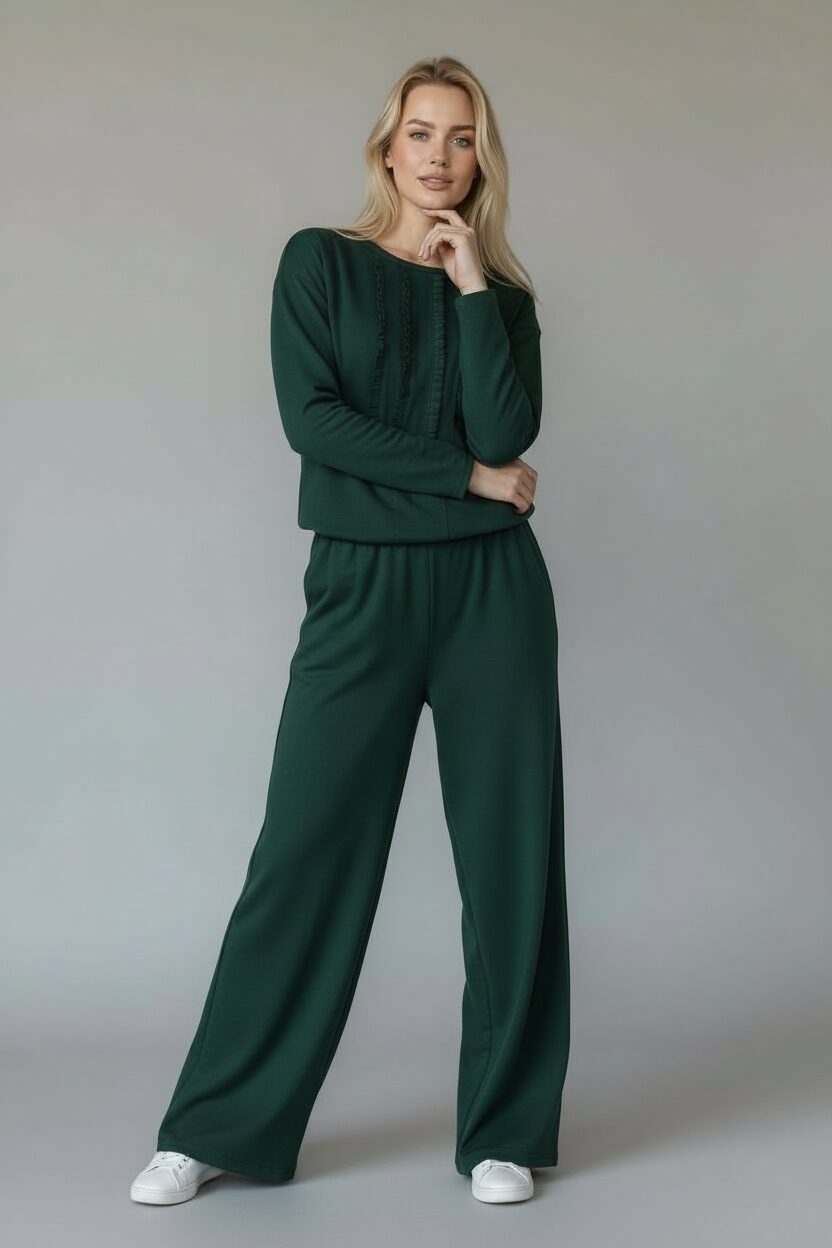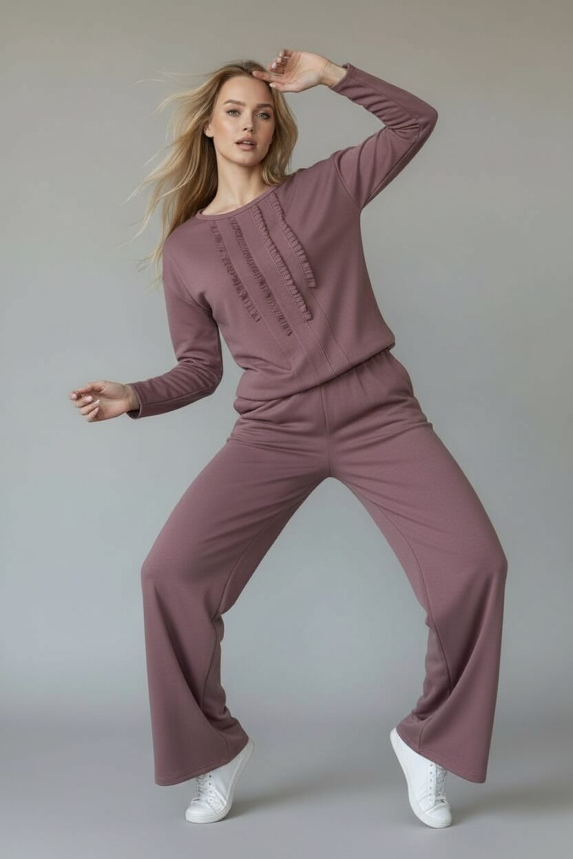 Patogus ir stilingas – puikus pasirinkimas vėsesniems orams. Kostiumėlį sudaro džemperis ir plačios kelnės, kuriuos galima nešioti kartu arba derinti atskirai.
