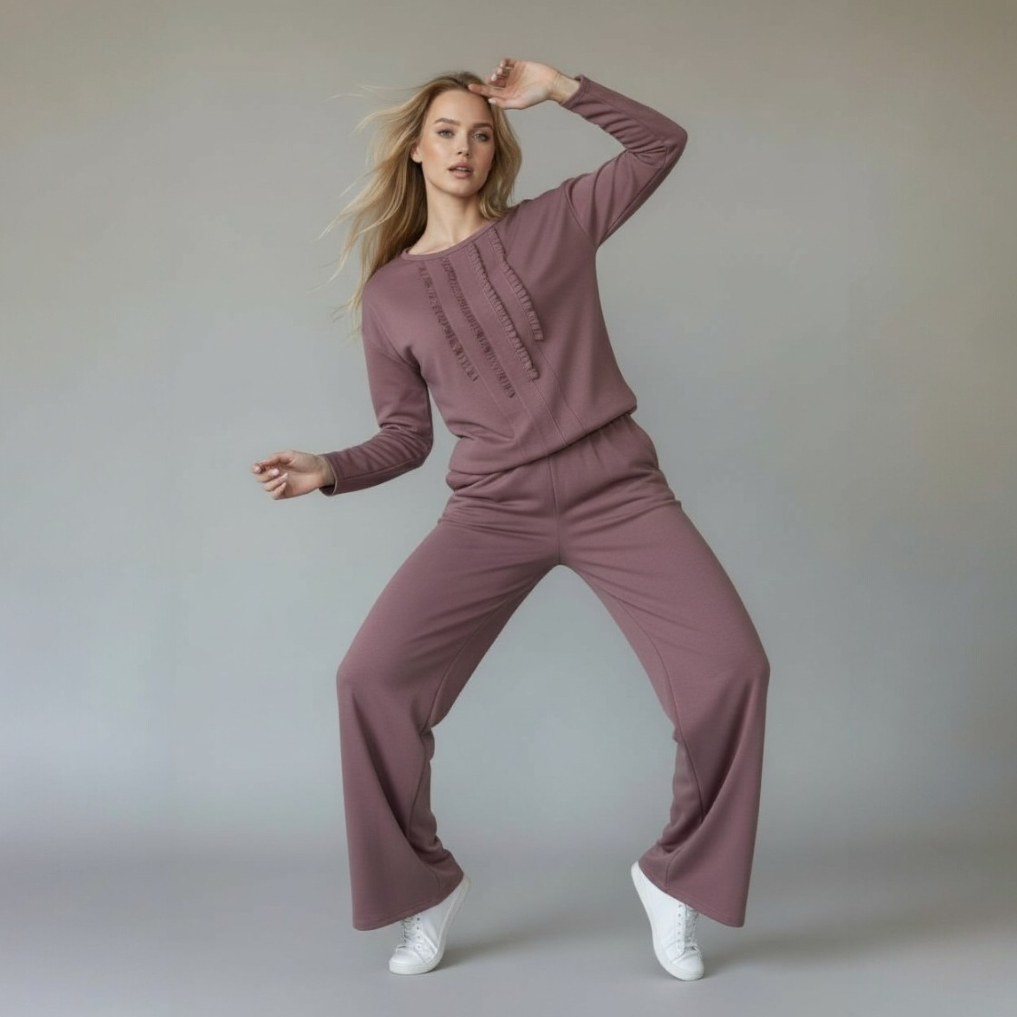 Laisvalaikio kostiumas su plačiomis kelnėmis pelenų rožinės spalvos