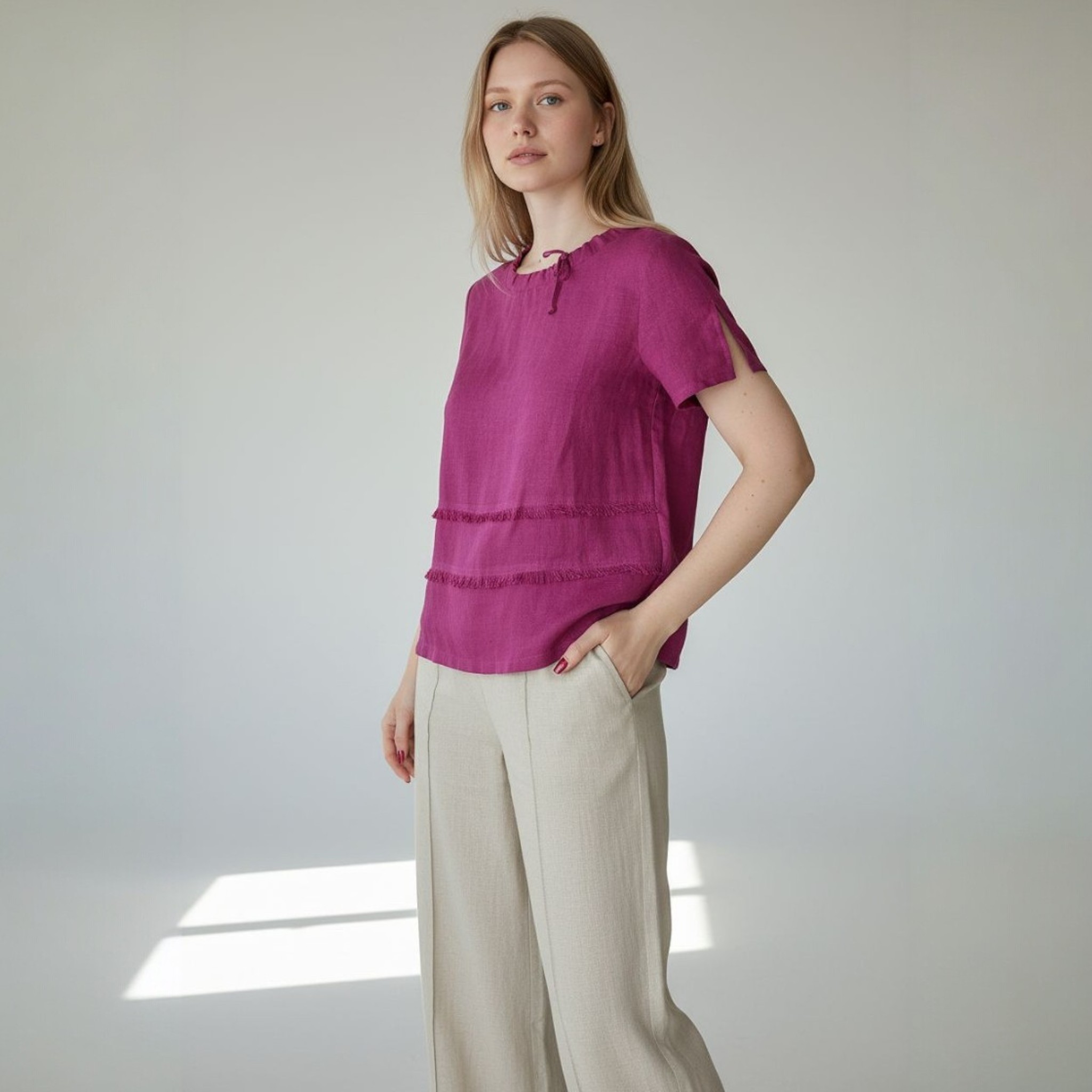 Moteriška lininė palaidinė su surišama kaklo iškirpte. Trumpomis rankovėmis su skeltuku ir kutų detalėmis priekyje. Laisvo kirpimo, lengva ir patogi visai dienai.