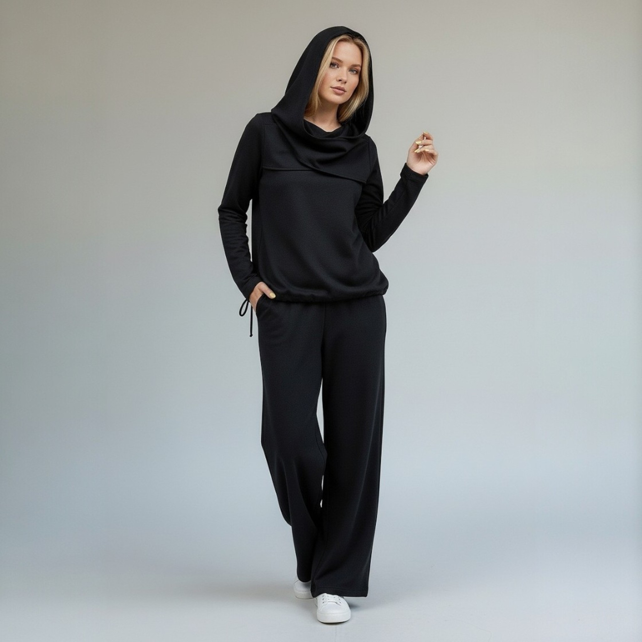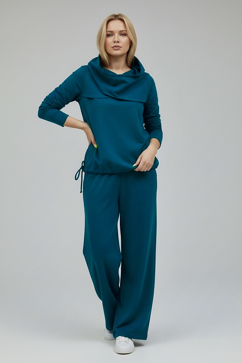 Plonesnio trikotažo laisvalaikio kostiumas su išskirtiniu gobtuvu, kuris priekyje susikryžiuoja. Džemperio apačią galima reguliuoti raišteliu. Laisvos plačios kelnės su kišenėmis – patogus ir stilingas derinys kasdienai. Pagamintas iš aukštos kokybės trikotažo (95% medvilnė, 5% elastanas), kuris nesivelia ir nepraranda formos. Kelnių ilgis – 104 cm, tačiau galime jį pritaikyti pagal jūsų ūgį.
