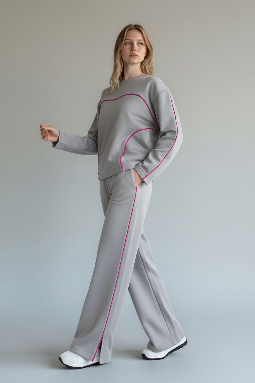 padėsime. Šviesiai pilkas, dekoruotas ciklameno spalvos juostele. Kelnių ilgis – 104 cm, tačiau galime jį pritaikyti pagal jūsų ūgį. Išsiuntimas per 5–10 darbo dienų.